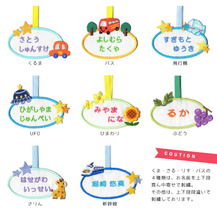 キャラクターを自分のマークとして覚えられるので、まだ文字の読めないお子様の持ち物にもピッタリ! ※1枚ごとの単価になります 商品詳細 サイズ 画像3をご参照ください 品質 (綿ブロード)綿100% (サテンリボン)ポリエステル100% (上糸)レーヨン100% (下糸)ポリエステル100% 裏面 EVA樹脂/アイロン接着対応 最大文字数 上段・下段それぞれ5文字程度 (漢字の場合は各4文字程度が限度です) 文字種 オリジナル書体…ひらがなのみ 丸ゴシック体…ひらがな/カタカナ/漢字/英数字 文字色 黒色/こげ茶/青みグレー/ブルー/水色/グリーン/キャロットオレンジ/チェリーピンク/パープル の9色よりお選びいただけます。
