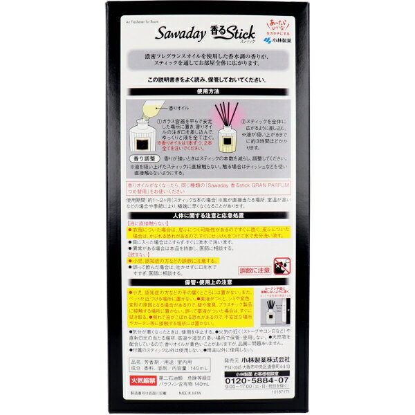 サワデー香るスティック グランパルファム 詰替用 パルファムブラン 140mLサワデー香るスティック グランパルファム 詰替用 パルファムノアール 140mLサワデー香るスティック グランパルファム パルファムブラン 140mL【サワデー香るスティック グランパルファム パルファムノアール 140mL】広告文責(有)イースクエアTEL:0120-532-772小林製薬株式会社個装サイズ:115X235X71mm個装重量:約445g内容量:140mLケースサイズ:60.4X26.3X23.5cmケース重量:約7.8kg製造国:日本【発売元:小林製薬】【品名】芳香剤【セット内容】ガラス容器、香りオイル、黒スティック【用途】室内用【成分】香料、溶剤【使用方法】(1)ガラス容器を平らで安定した場所に置き、香りオイルの注ぎ口を差し込んで、ゆっくりと液を全て注ぐ。