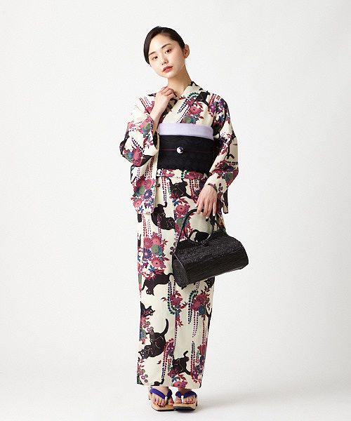【セット内容】 ●浴衣「夜空猫」:パープル(モデル身長:160cm) 定価:¥33,000(税込) 夜空を見上げて佇む猫と、咲き乱れる藤や菊柄がマッチした、ふりふならではのレトロとモダンが融合したテキスタイル。