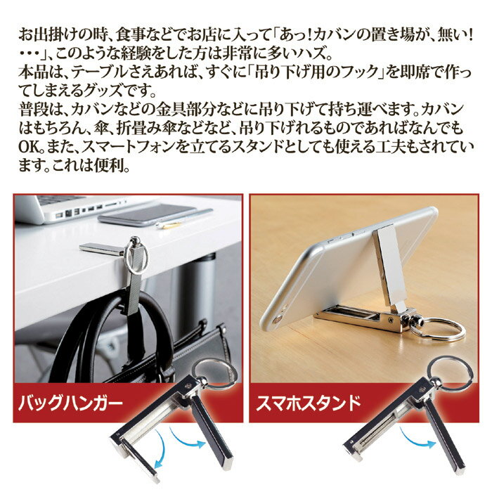 バッグハンガーが、スマホスタンドにもなる! 出先でテーブルにバッグが吊るせるモバイルハンガー! スマホを立てるスタンドにもなる! お出掛けの時、食事などでお店に入って「あっ!カバンの置き場が、無い!・・・」、このような経験をした方は非常に多いハズ。