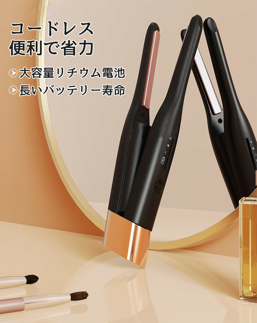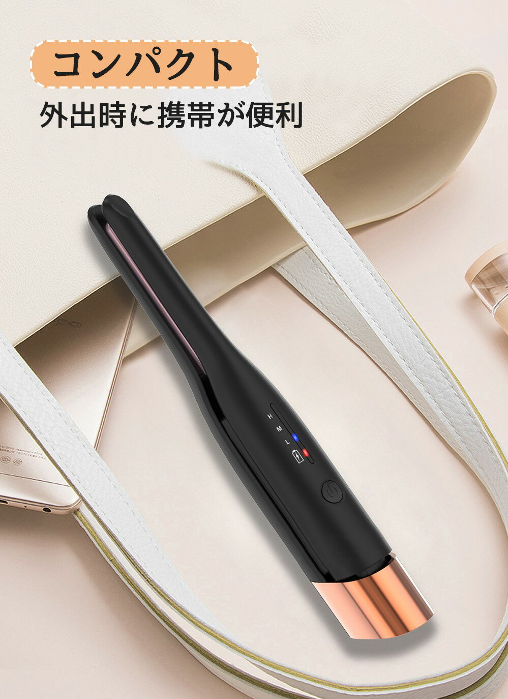 重量:約160g サイズ:約22*4*3CM ■コードレスので、いつでもどこでも使える 高品質リチウムイオン電池を内蔵し、付属のUSBケーブルで充電しておけば、いつでもどこでもヘアセットができる充電式コードレスタイプです。